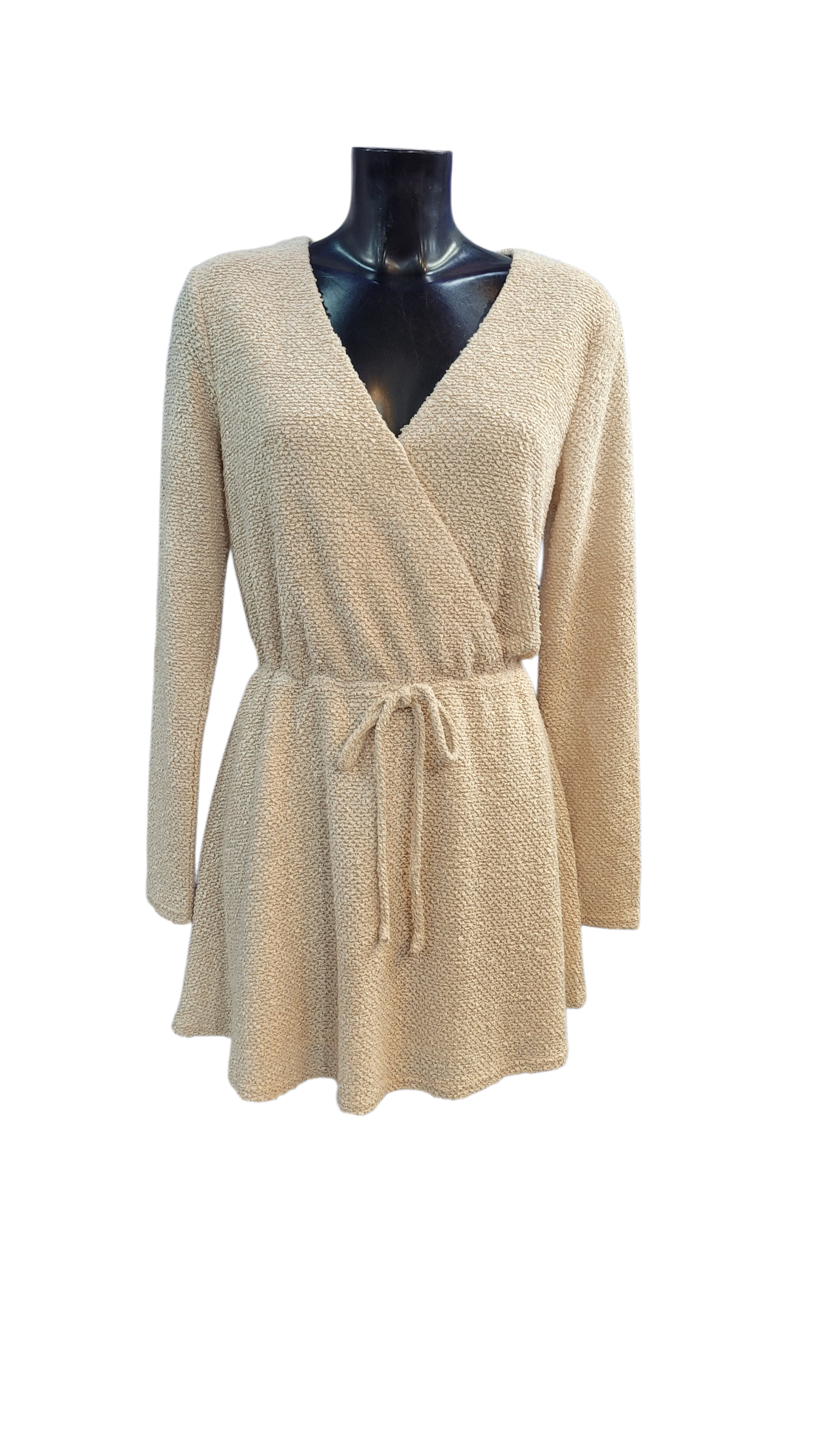 Modelo de escote cruzado con cintura elasticada en corte A.